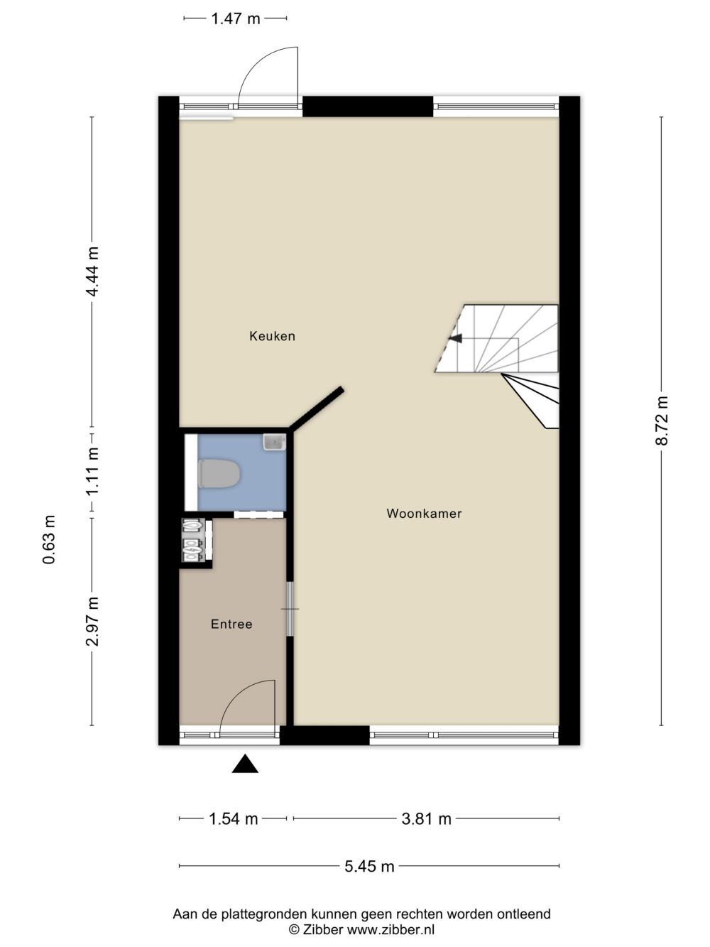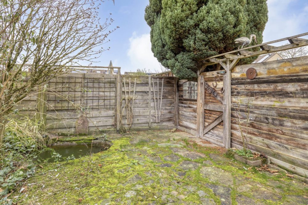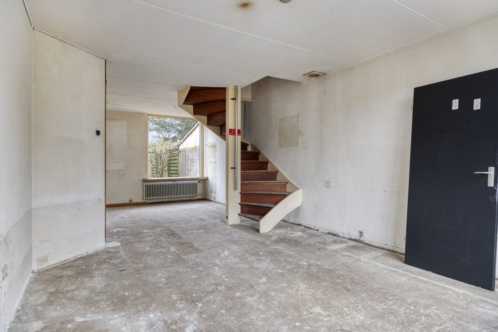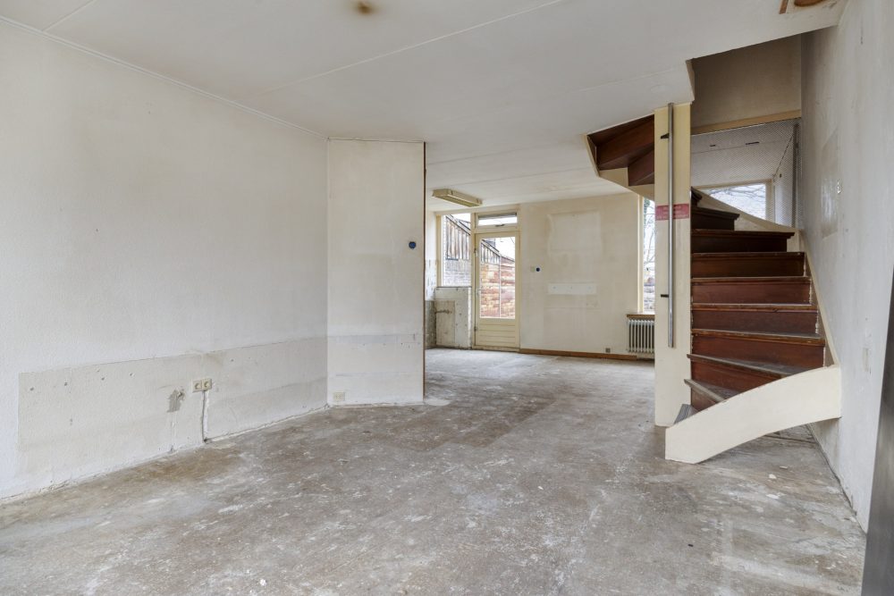 Begane grond: entree, hal met meterkast en toilet met fonteintje. Binnenkomst in de woonkamer welke aan de voorzijde is gelegen, open trap naar de verdieping met aan de bovenzijde een handig tochtportaal, tuingerichte eethoek met zicht op de keuken. Er is momenteel geen keuken aanwezig, deze is reeds gesloopt. Loopdeur naar de achtertuin op het noordoosten met voldoende privacy en achterom bereikbaar. Vrijstaande stenen berging aan de voorzijde van de woning.