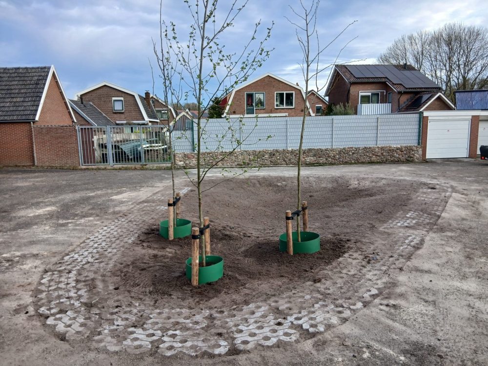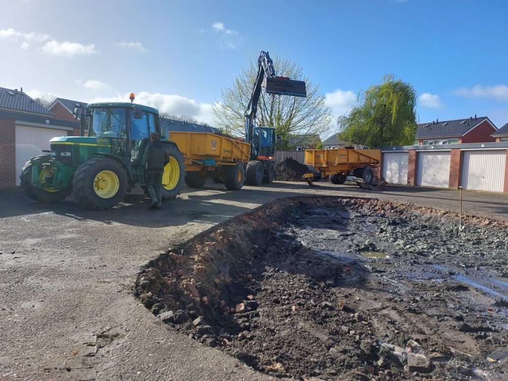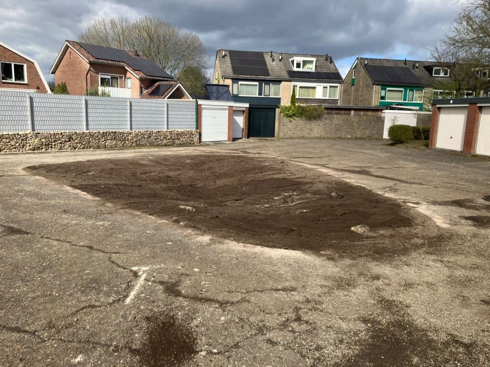 Op het asfaltplein bij de garages aan de Molkenboerstraat in Zuid-Berghuizen maken we ruimte voor groen. Hier realiseren we een wadi van circa 80 m²: een slimme, natuurlijke voorziening die regenwater tijdelijk opvangt bij hevige buien. Zo helpen we het riool te ontlasten en houden we water langer vast in de omgeving.